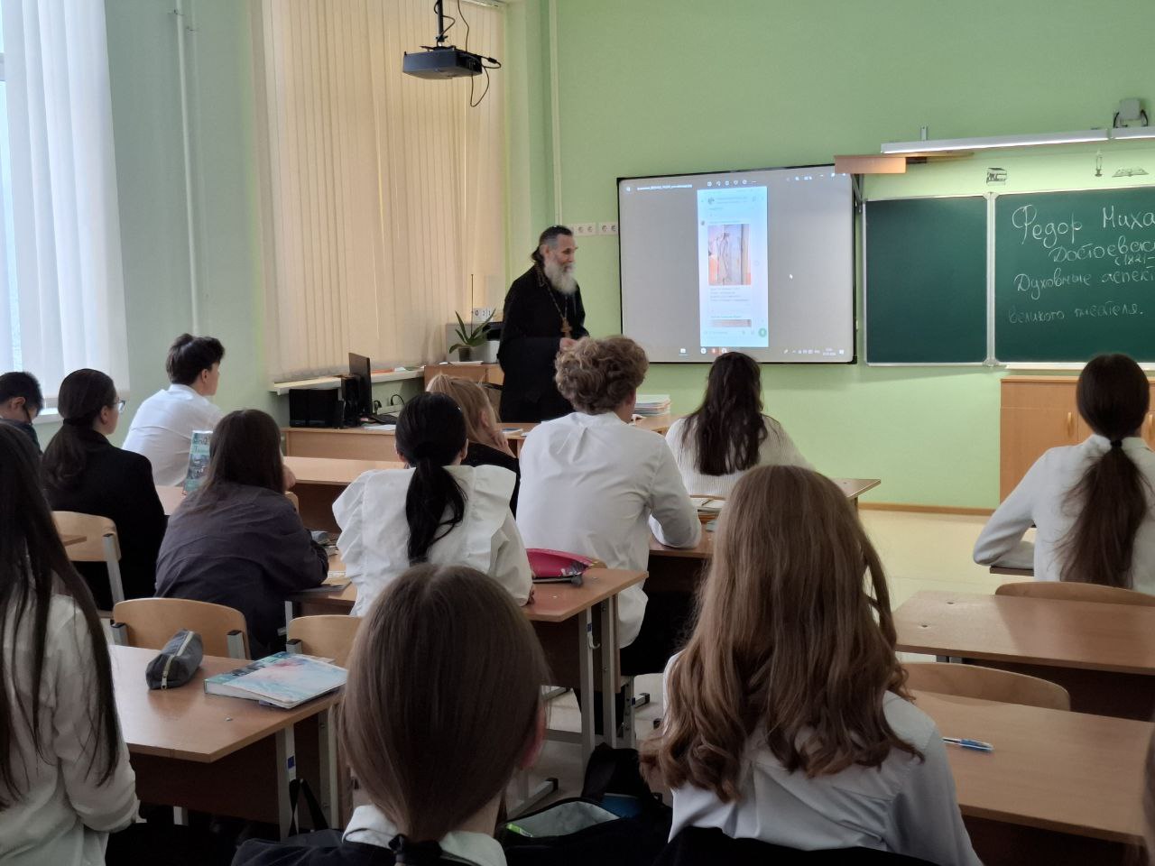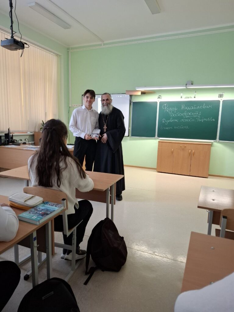 21 января в МБОУ «Гимназия имени Подольских курсантов» г. Подольск состоялась духовно-просветительская беседа для учащихся 11 класса на тему: «Фёдор Михайлович Достоевский: духовные аспекты в творчестве великого писателя». Беседу провёл клирик храма Сергия священномученика иерей Павел Шемин. Священнослужитель рассказал старшеклассникам о глубоком православном мировоззрении писателя, его размышлениях о вечных вопросах добра и зла, свободы и ответственности, о духовных исканиях героев его произведений. Особое внимание было уделено христианскому пониманию человека в творчестве Достоевского, его вере в возможность нравственного преображения и спасения даже самых падших душ.
