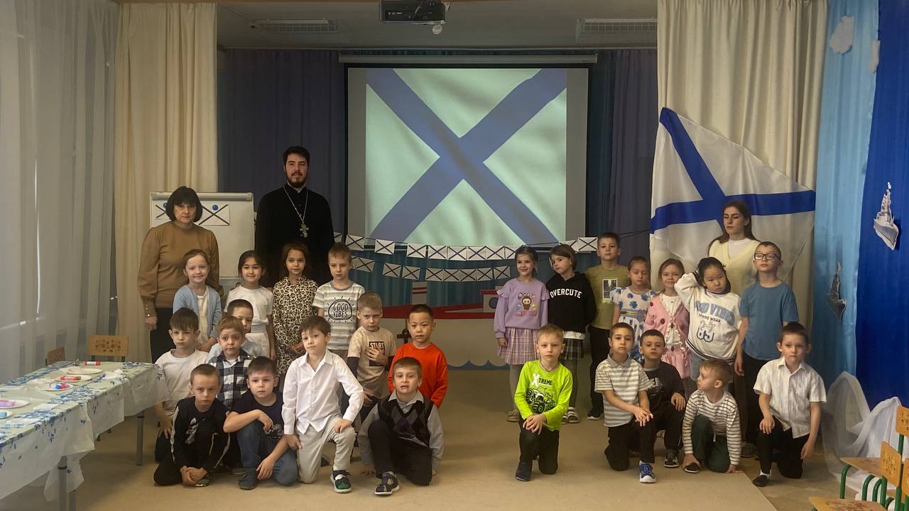 17 февраля клирик Троицкого кафедрального собора в Подольске иерей Николай Бородкин посетил дошкольное отделение МОУ «Лицей №23» г. Подольска. Отец Николай провел встречу с родителями и воспитанниками на тему: «Родина, Отечество и Андреевский флаг».