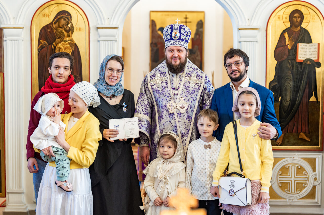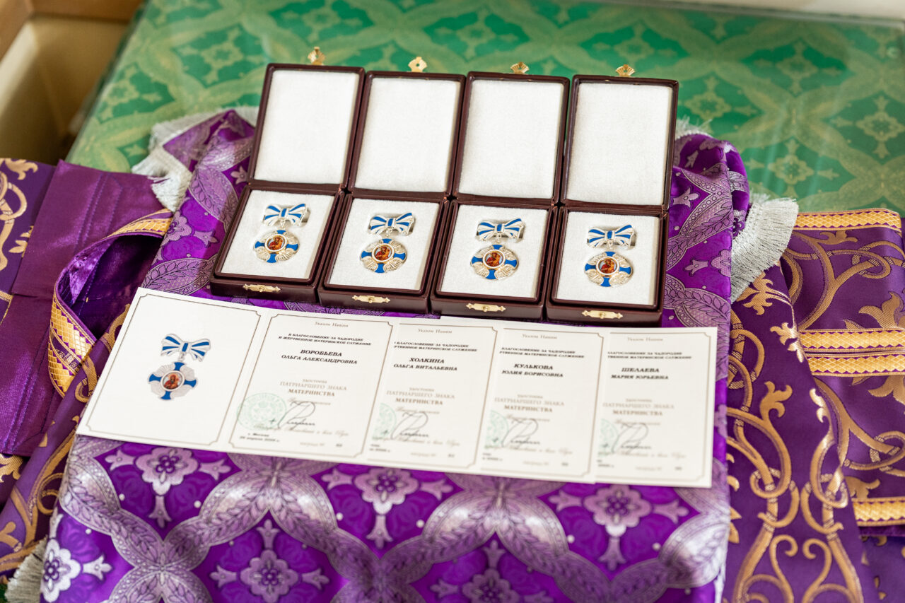 Затем архиепископ Аксий вручил Патриарший знак материнства II степени жительницам Подольска М.Ю.Шелаевой, О.А.Воробьёвой, О.В.Холкиной и Ю.Б.Кульковой.
