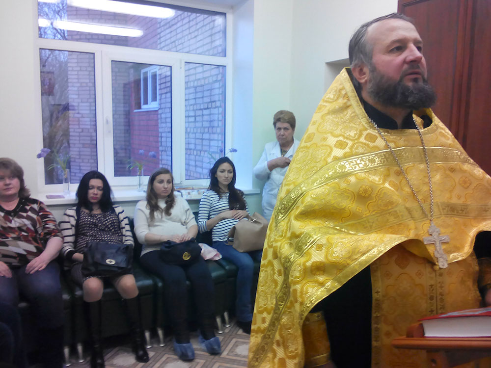 19 ноября настоятель Георгиевского храма города Подольска священник Александр Никитин и настоятель Благовещенского храма с.Матвеевское священник Андрей Саломасов совершили молебен с акафистом Божией Матери «Помощница в родах» в молельной комнате Подольской гинекологии. По окончании богослужения священники провели с беременными женщинами миссионерскую беседу, рассказав о Святых Бесплотных Силах и о Святом Причастии.