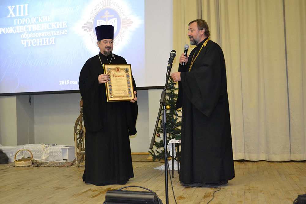 3 декабря в Подольском городском округе открылись XIII-е городские Рождественские образовательные Чтения. Открытие прошло в Лицее № 26. Тема нынешних Чтений звучит так: «Традиция и новации: культура, общество, личность». На этом мероприятии присутствовали педагоги школ и дошкольных учреждений, работающие на поприще духовно-нравственного воспитания детей, Благочинный и клирики церквей Подольского церковного округа. В библиотеке лицея были представлены творческие работы детей, посвященные Рождеству Христову и теме Православия. В начале работы Чтений с вступительным обращением к присутствующим выступил председатель Комитета по образованию Администрации Подольского городского округа Клоков Е.В. В ходе работы Чтений прозвучали доклады священников и учителей Подольских школ, в которых поднимались различные аспекты духовной и образовательной деятельности. Между докладами выступали дети, занявшие первые места в творческих конкурсах, проходивших в школах в рамках XIII-х городских Рождественских образовательных чтений. В конце всех выступлений Клоков Е.В. ещё раз поздравил всех участников Чтений, поблагодарил за труды и вручил благодарственные грамоты отличившимся педагогам и ученикам. С заключительным словом выступил Благочинный церквей Подольского округа протоиерей Олег Сердцев и пожелал всем собравшимся Божией помощи в трудном, но благодатном деле воспитания наших детей и молодёжи. Он вручил Благодарственные грамоты от Подольского благочиния учителям и детям, победившим в творческих конкурсах.
