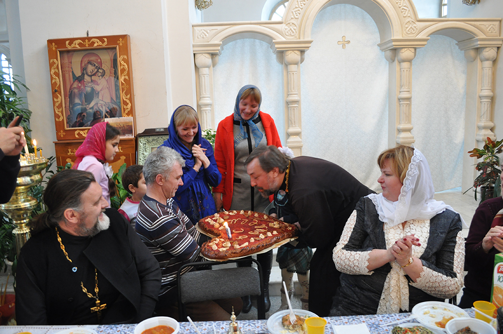 10 февраля прихожане храма Иоанна Богослова с. Сынково поздравили настоятеля протоиерея Александра Харламова с 50-летием, а также награждением его медалью Московской Епархии «За усердное служение». По окончании Божественной литургии в тёплой и радостной обстановке звучали слова признательности и добрые пожелания юбиляру, взрослые и дети читали стихи, исполняли песни. Было много сюрпризов и творческих подарков – видеопрезентация и фотоальбом о приходской жизни, художественный календарь с видами сынковского храма, поздравительные публикации в газетах, огромный именинный пирог.
