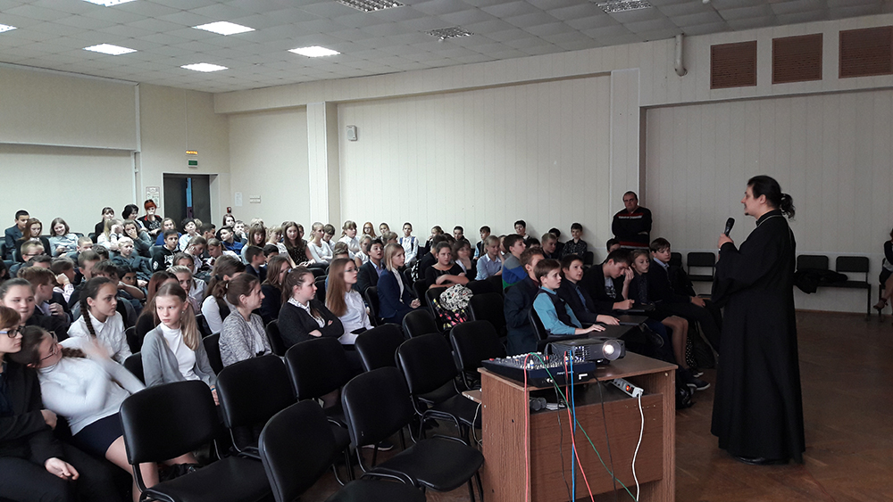 28 сентября настоятель Георгиевского храма ГО Подольск священник Александр Никитин и руководитель центра духовного патриотического и нравственного воспитания молодежи Подольского благочиния Сергей Викторович Медведев выступили перед старшеклаcсниками в актовом зале 5 школы и рассказали об основных направлениях работы Центра. Учащимся был показан небольшой фильм и презентация о духовном и патриотическом воспитании в Подольском благочинии.