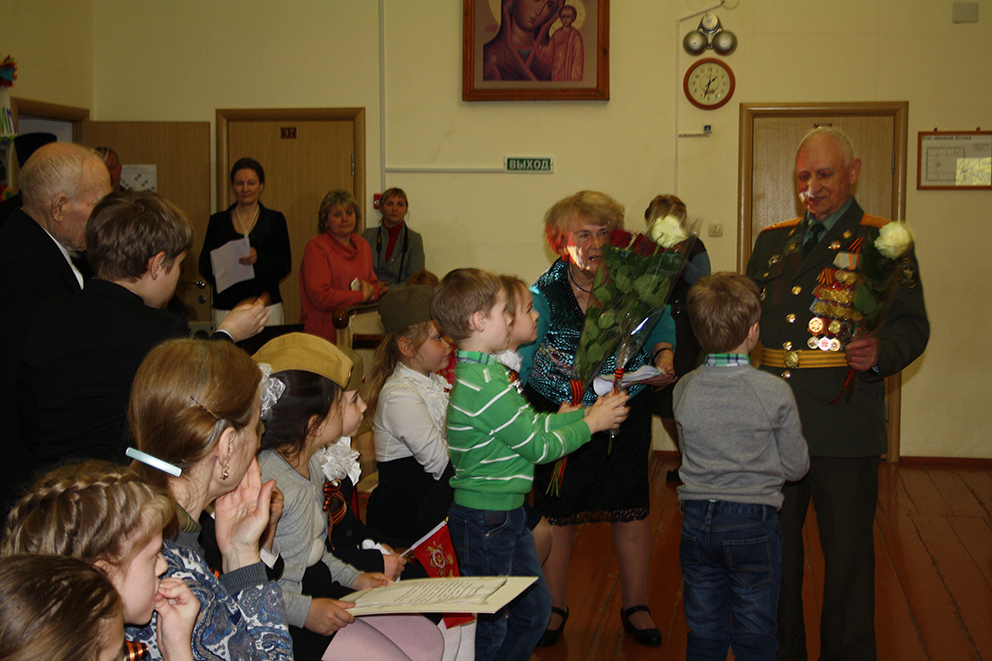 10 мая 2017 г. в православной гимназии Троицкого собора г. Подольска традиционно прошел открытый урок, посвященный 72-ой годовщине Победы в Великой Отечественной войне, на который были приглашены все учащиеся и их родители. Провела этот урок классный руководитель четвертого класса гимназии Мишина Татьяна Владимировна. А самыми почетными  гостями  в этот день были ветераны войны — Герасимов Николай Иванович и Алпатов Иван Николаевич, медали и ордена которых, сами говорили про их военное прошлое. Преподаватели и учащиеся ответственно подготовились к этому праздничному уроку: украсили цветами фотографии своих родственников, участвующих в Великой отечественной войне, сделали открытки и аппликации, посвященные Великой Победе, рассказали о своих погибших на войне родственниках и о тех, кто пережил эту войну. Дети читали проникновенные стихотворения и прозу о событиях военных лет, о героических поступках в военные годы. На экране были показаны документальные кадры военных лет с участием  детей,  сверстников сегодняшних гимназистов, которые стали героями в годы Великой Отечественной войны. Звучали песни военных лет. В конце урока к детям обратился священник Константин Семенов, преподаватель Закона Божьего в гимназии, который сказал о том, что в дни, когда все верующие христиане переполнены радостью о Воскресшем Спасителе, Который принес Себя в жертву за всех людей и Воскрес из мертвых, когда звучат слова приветствия: «Христос Воскресе!» мы вспоминаем и о той жертве, когда люди, сражаясь с врагом, жертвовали своей жизнью ради других людей и, как сказано в Евангелии, что нет больше той любви, если, кто положит душу свою за ближнего своего. И мы всегда должны помнить о том жертвенном подвиге, который совершили воины, защищаю нашу Родину от врага. С поздравительным словом к ветеранам обратилась директор гимназии Жанна Александровна Франко. А дети подарили  ветеранам цветы. В конце праздничного мероприятия была сделана общая фотография с ветеранами на долгую и добрую память.