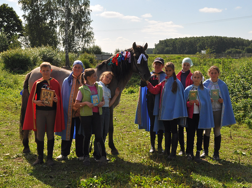 Святые мученики Флор и Лавр издревле почитаются сугубыми заступниками всех, занимающихся животноводством, а в особенности – коневодством. В старину день их памяти, 31 августа, широко праздновался во всех русских деревнях: лошадей освобождали от работы, украшали и приводили к храмам, где после молебнов окропляли их святой водой. Своим праздником считают этот день и в детском благотворительном конном клубе «Святой князь Владимир», работающем при Воскресной школе храма Иоанна Богослова с. Сынково. В последний день лета, 31 августа 2017 г, ученики конного клуба с особой заботой ухаживали за своими любимцами: почистили, заплели с лентами гривы и хвосты. Руководительница конного клуба Минкевич Т.В. познакомила собравшихся ребят и родителей с житием святых мучеников Флора и Лавра, а после все вместе (среди участников конного клуба есть и ребята, занимающиеся клиросным пением) прочитали Акафист и помолились святым. Потом испили припасённой воды из святого источника и окропили ею лошадей. За общим чаепитием с испечёнными одной из мам сладостями обменялись впечатлениями о прошедшем лете и планами на учебный год. Потом вывели лошадей на небольшую верховую прогулку, законченную к общей радости детей, тренировочной общей скачкой, пастьбу и памятное фотографирование.
