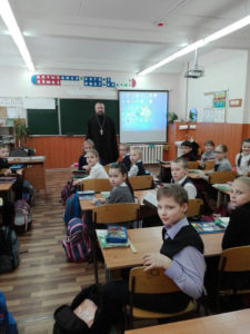 7 декабря в средней общеобразовательной школе №13 ГО Подольск настоятель храма Благовещения Пресвятой Богородицы д. Матвеевское священник Андрей Саломасов провел урок «Основы религиозных культур и светской этики» для 4 класса. Вместе с батюшкой ребята отправились в путешествие по Ветхому завету, в котором вспоминали дни сотворения мира, грехопадение и его последствия, потомков Адама и Евы. Ребята приняли живое участие в беседе, а затем задали интересующие их вопросы. Закончилась встреча совместным фотографированием.