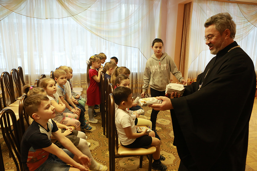 12 января в Святочные дни настоятель Ильинского храма в Лемешеве (с.Лемешово) Г.О. Подольска, протоиерей Петр Дынников посетил детский сад №56. Он рассказал детям о Рождении Младенца Иисуса и поздравил всех с великим праздником. Не обошел вниманием и трудных детей из коррекционной группы. Все дети получили сладкие подарки.