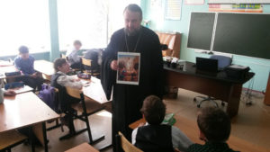 11 апреля, на Светлой седмице, настоятель храма Благовещения Пресвятой Богородицы д. Матвеевское священник Андрей Саломасов посетил 4 класс Средней общеобразовательной школы №13, где поздравил учеников со Светлым праздником Пасхи. Батюшка показал ребятам изображения пасхальных икон, рассказал о Евангельских событиях. Ребята сами рассказывали о. Андрею, что уже знают о Воскресении Христовом, а также задавали интересующие вопросы. Отец Андрей отметил, что дети много знают о празднике, и пожелал им дальнейших успехов в изучении слова Божия.