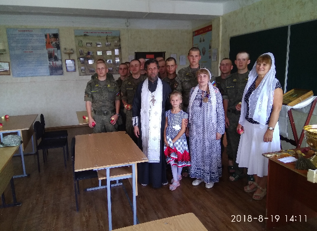 19 августа в день празднования Преображения Господня в храме Воскресения Словущего д. Сертякино состоялась Божественная литургия. После этого прихожане храма вместе с настоятелем протоиереем Борисом Трещансиким поспешили в подшефную воинскую часть, расположенную в Димитрово, где их встретил зам. командира полка по работе с личным составом подполковник Григорий Николаевич Гребцов. Был отлужен водосвятный молебен, на котором освящались плоды нового урожая для раздачи военнослужащим. Настоятель храма протоиерей Борис Трещанский рассказал военнослужащим о происхождении праздника Преображения Господня, о его значении для православных христиан, окропил солдат святой водой. В своем слове, обращенном к собравшимся военнослужащим, пожелал им благоденствия, здоровья, и сил на воинское служение. Велико служение защитника Отечества — ведь по слову, сказанному в Священном Писании вы полагаете жизни свои за други своя.
