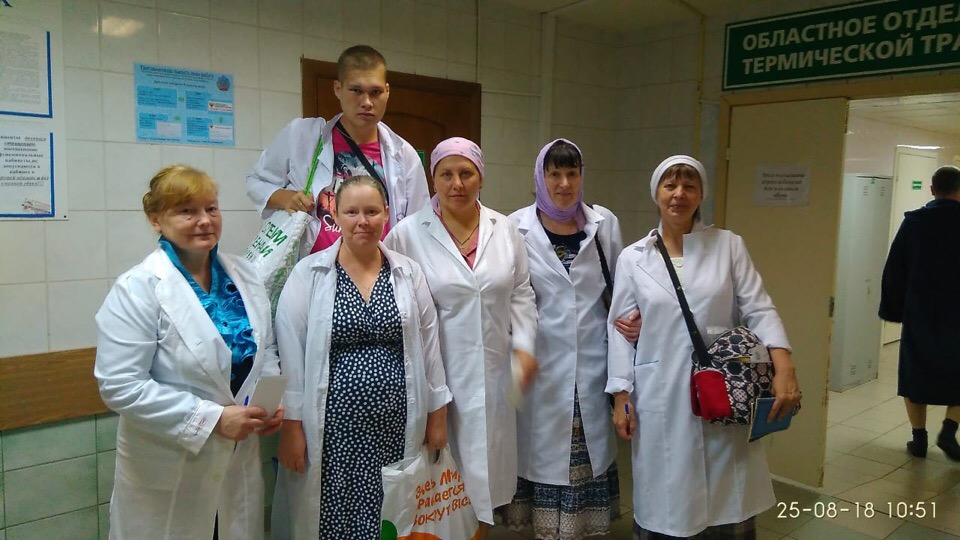 Как обычно, в субботу 25 августа братья и сестры Георгиевского сестричества милосердия навестили болящих в отделениях термической травмы и гнойной хирургии второй городской больницы. На прошлой неделе было очень много причастников, около 30 человек, и уже заранее на этой неделе много пациентов начинают готовиться к Таинству Причастия и ожидать следующего приезда батюшек. Братья и сестры принесли сегодня святую воду, духовную литературу, собрали записочки по палатам для последующей молитвы в храме, утешили и приободрили больных. Дай Бог здравия и скорейшего выздоровления им всем!
