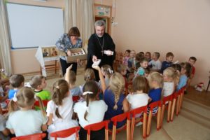 В рамках проведения акции «Согреем детские сердца» 5 октября, настоятель Ильинского храма в Лемешеве Г.о. Подольск протоиерей Петр Дынников с директором и преподавателем воскресной школы посетили детский сад № 56 «Рябинка». Получился занимательный урок-праздник по теме «Храмы Подмосковья». Дети читали тематические стихи, настоятель задавал наводящие вопросы и беседовал с ними. В конце все получили подарки.