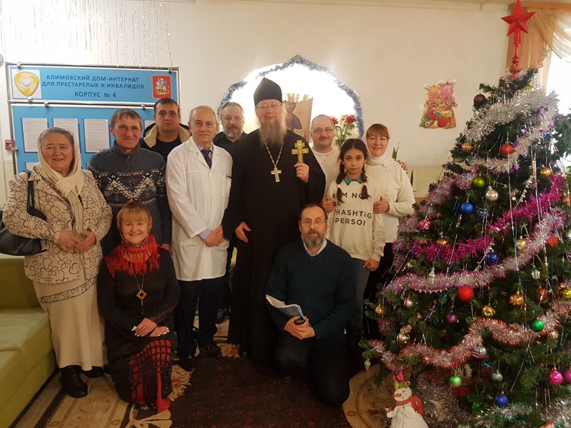 8 января на Святках настоятель Всехсвятского храма г.Климовска игумен Феодор(Яблоков) с прихожанами посетили 4-й корпус в Климовском Доме-Интернате для престарелых и инвалидов. Приходской хор радостно пел Рождественские песнопения, а Настоятель с прихожанами и учениками Воскресной школы лично поздравил всех проживающих в 4-м корпусе тяжелобольных и вручил им рождественские подарки.