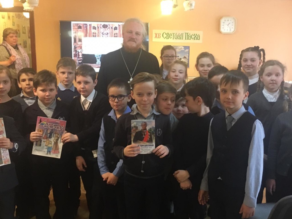 18 апреля в центральной климовской детской библиотеке мкр.Климовск клирик храма сщмч. Сергия священник Александр Орлов провел встречу с учениками 3 класса МБОУ СОШ N6 и рассказал им о значении праздника Пасхи, особенностях богослужения в эти дни  и о Евангельских событиях Воскресения Христова.