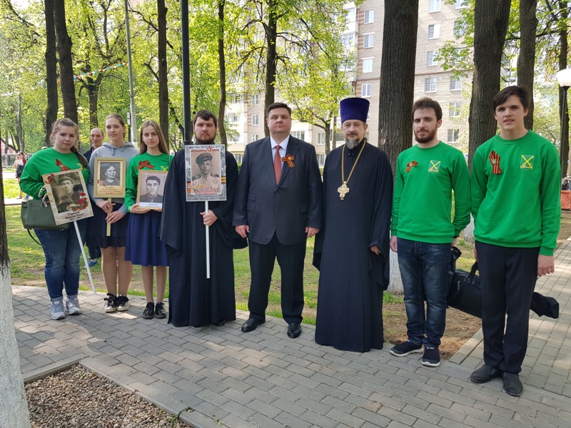 09 мая 2019 года, благочинный церквей Подольского округа протоиерей Олег Сердцев, клирик Троицкого собора священник Виталий Писарев и члены молодежной организации «Протос» приняли участие во Всероссийской акции «Бессмертный Полк», которая проходила по главным улицам Подольска. Шествие завершилось на площади Славы, где состоялся митинг, посвящённый 74 годовщине Победы в Великой Отечественной Войне. С Днем Победы собравшихся поздравили глава Городского округа Подольск Николай Игоревич Пестов, протоиерей Олег Сердцев и другие почетные гости. Память павших участники торжественного мероприятия на площади Славы почтили минутой молчания. Затем все участники возложили цветы к Вечному огню.