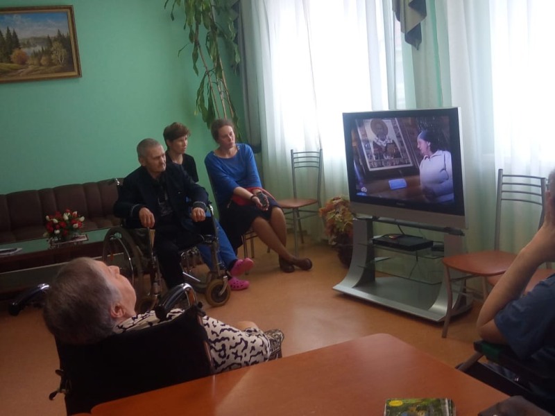 25 мая в колясочном отделении интерната состоялась вторая встреча киноклуба, организованная совместными усилиями волонтерского движения «Милосердие. Подольск» и прихожанами Матвеевского Благовещенского храма. На этот раз вспоминали святителя Николая, память которого православная церковь чествовала три дня назад. Волонтеры Милосердия напомнили наиболее известные сюжеты жития горячо любимого всеми святого, в заключении чего все вместе посмотрели прекрасную песочную анимацию Ксении Симоновой, посвящённую житию святителя Николая. Поговорили также о свидетельствах помощи святителя Николая в наши дни, кто-то поделился личным опытом обращения за помощью к этому удивительно отзывчивому и чуткому святому. В продолжение темы, посмотрели документальный фильм-расследование, посвящённый загадочной истории о так называемом «стоянии Зои». По окончании фильма состоялась непродолжительная беседа о том, что пережить чудо или стать свидетелем чуда, человеку даётся не для того, чтобы «заставить» его верить, но в первую очередь , чтобы дать ему возможность поиска Богообщения и переосмысления собственной жизни. Попрощавшись с участниками встречи, волонтеры посетили искусных рукодельниц, проживающих в колясочном отделении: Ирину, которая вяжет кукол для благотворительных ярмарок и Зинаиду Григорьевну, которая способна превратить обувную коробку в шикарный расписной короб, а пластмассовые крышки в декоративные настенные тарелки с яркими живописными пейзажами.