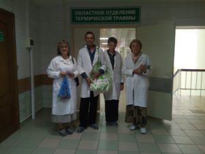 В Троицкую Родительскую Субботу братья и сестры Георгиевского сестричества милосердия навестили пациентов областного отделения термической травмы и гнойной хирургии во второй городской больнице. Собрали записочки для поминовения о здравии и упокоении, раздали святую воду и, конечно, поговорили с пациентами, каждому болящему уделили внимание. По слову святых отцов, стараясь утешать болящих не только услугами, сколько веселым лицом. Ведь приятно дарить людям улыбку и хорошее настроение. Слава Богу за всё!