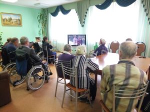 В прошедшие выходные в колясочном отделении 2 корпуса Климовского дома-интерната для престарелых и инвалидов состоялась традиционная субботняя встреча в рамках киноклуба, организаторы которого — волонтерское движение «Милосердие — Подольск» и прихожане Благовещенского храма дер. Матвеевское. Каждую вторую субботу добровольцы представляют своим подопечным интересную картину с духовно-нравственным содержанием. Продолжительный период мы просматривали художественные и документальные короткометражки, учитывая состояние здоровья проживающих отделения. По инициативе самих подопечных решились на просмотр длинной картины. После некоторого согласования к просмотру была утверждена военная драма реж. Владимира Хотиненко «Поп». В начале встречи договорились однако, что если подопечные устанут, то дадут знак (все волновались, так как 30-40 минут до сих пор были оптимальным временами для просмотра). Неподвижно сидеть в кресле, либо на жёстком стуле для некоторых подопечных действительно нелегко, но решили попробовать. В итоге посмотрели до конца первую серию, после чего остановили просмотр, отложив вторую часть на следующую встречу. По реакции зрителей было очевидно, что фильм всем понравился и заинтересовал своим окончанием. Еще немного пообщавшись (вспомнили о прошедшем празднике Изнесения Честных Древ Животворящего Креста Господня), волонтеры и подопечные интерната попрощались до следующей встречи.