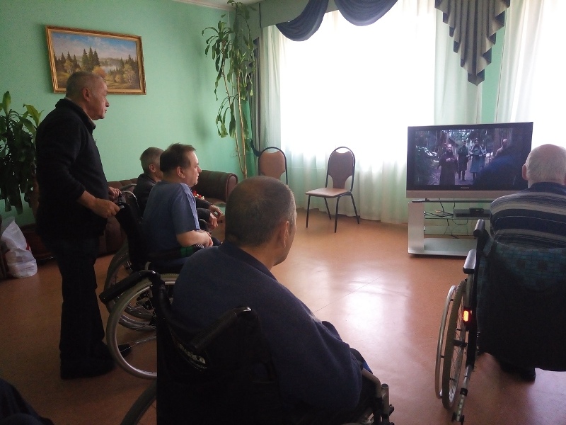 Сегодня в колясочное отделение 2 корпуса Климовского дома-интерната для престарелых и инвалидов пришли волонтеры «Милосердие – Подольск» и прихожане Благовещенского храма дер. Матвеевское, потому что сегодня суббота, и у нас очередная встреча киноклуба. Проживающие этого отделения уже привыкли к добровольцам из Подольского благочиния: кто-то бывает постоянно, а кто-то только присматривается; кто-то выбор фильмов доверяет нам, а кто-то просит посмотреть свой любимый фильм. После просмотра — обязательно обсуждение увиденного и общение. На сегодняшней встрече продолжили просмотр фильма «Поп» режиссера Владимира Хотиненко. Великолепная игра актеров Сергея Маковецкого, Нины Усатовой, Елизаветы Арзамасовой и затронутые в картине темы (о роли Церкви в Великой Отечественной войне, о личном мужестве и жертвенной любви, о вере в Бога) никого не оставили равнодушными. Беседу о помощи в сложных ситуациях и в болезни по молитвам к Господу и Богородице продолжил наш доброволец Александр. Он поделился реальными историями, свидетелем которых был, много лет помогая в качестве волонтера в ожоговом отделении 2-й городской больницы. Живой отклик в сердцах присутствующих на встрече людей нашли затронутые сегодня темы. Проживающие в отделении, сами много пережившие, делились своим переживаниями и проблемами.