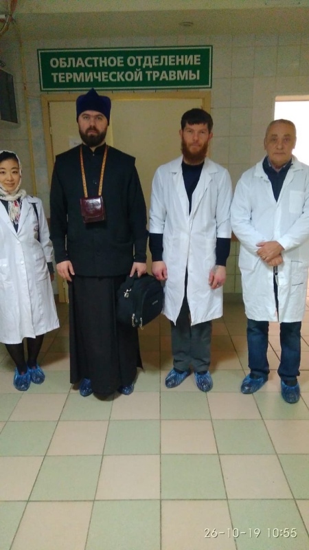 В субботу 26 октября в ожоговое отделение вместе с братьями и сёстрами Георгиевского сестричества приехал настоятель Георгиевского храма священник Александр Рульников для того, чтобы причастить болящих. Среди пациентов, которые с нетерпением ждали батюшку, было несколько совсем пожилых бабушек, и людей с тяжелыми термическими травмами. В этот день Святых Христовых Тайн причастились 8 человек. Братья и сестры помогали батюшке, и конечно, принесли и раздали святую воду, написали записочки на литургию. Слава Богу за всё!