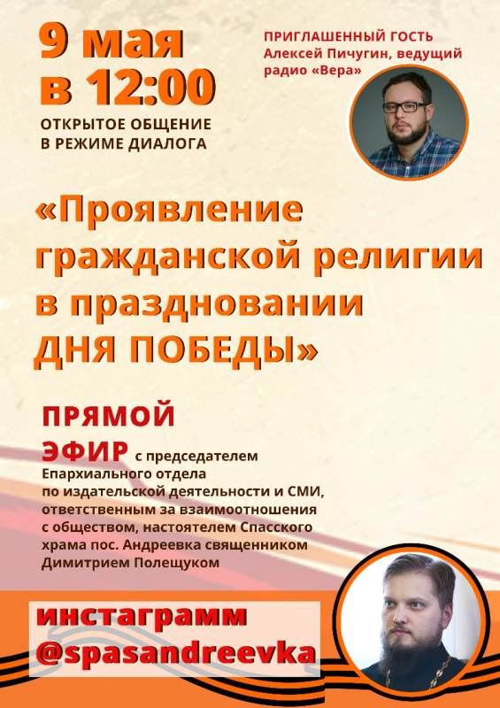 Дорогие братья и сестры! 9 мая в 12:00 на инстаграмм-канале @spasandreevka состоится прямой эфир в формате открытой беседы с председателем Епархиального отдела по издательской деятельности и СМИ, ответственным за взаимоотношения с обществом, настоятелем Спасского храма пос. Андреевка — священником Димитрием Полещуком. Приглашенный гость — Алексей Пичугин, ведущий радио «Вера». Дорогие друзья вы сможете в открытой беседе пообщаться и задать интересующие Вас вопросы.