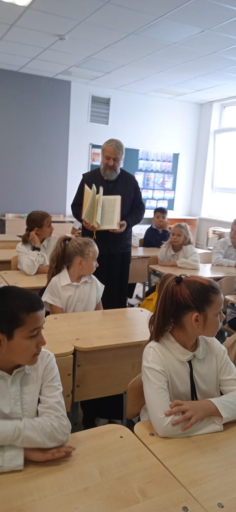 18 сентября настоятель храма Благовещения Пресвятой Богородицы д. Матвеевское г.о. Подольск иерей Андрей Саломасов начал знакомство с четвероклассниками МОУ «Бородино» с темы «Введение в Библию» (программа ОРКСЭ). За многолетнее сотрудничество с Церковью отец Андрей вручил завучу школы благодарственную грамоту.