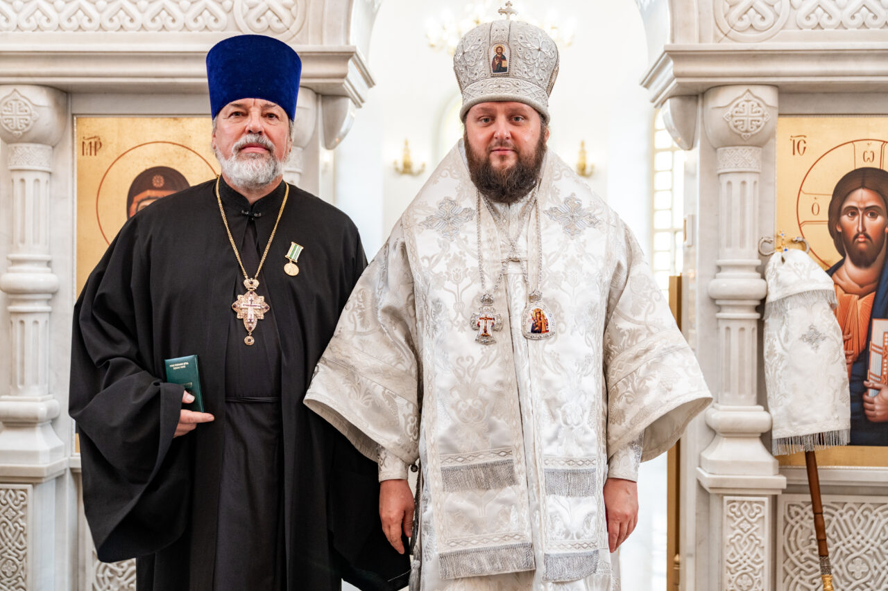 Далее владыка Аксий наградил настоятеля храма протоиерея Александра Харламова медалью преподобного Варлаама Серпуховского I степени и вручил епархиальные награды сотрудникам и прихожанам. На молитвенную память владыка подарил приходу Рудненский образ Пресвятой Богородицы.