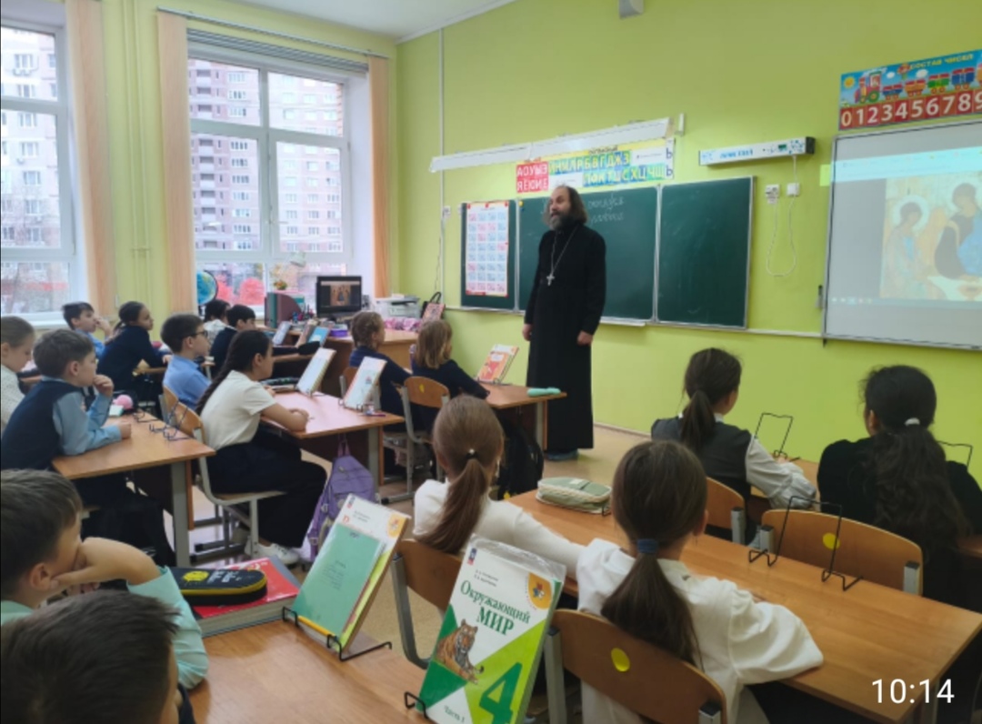 30 октября настоятель Александро-Невского храма п. Александровка в рамках проекта «Диалог со священником» провел уроки в двух четвёртых классах. Тема урока была посвящена православной иконе. Отец Сергий рассказал детям о Нерукотворном Образе Христа Спасителя и значении икон в жизни христианина.