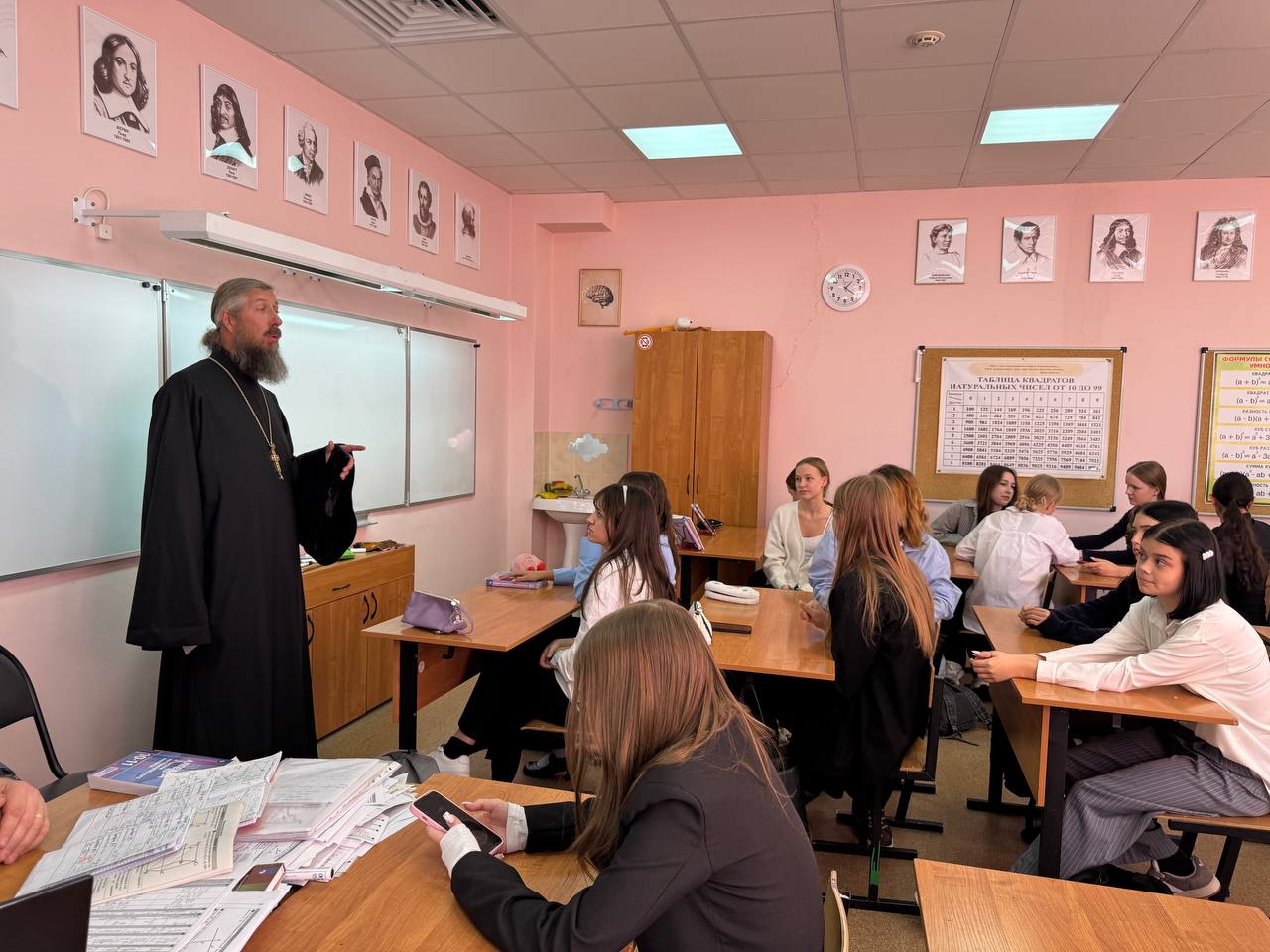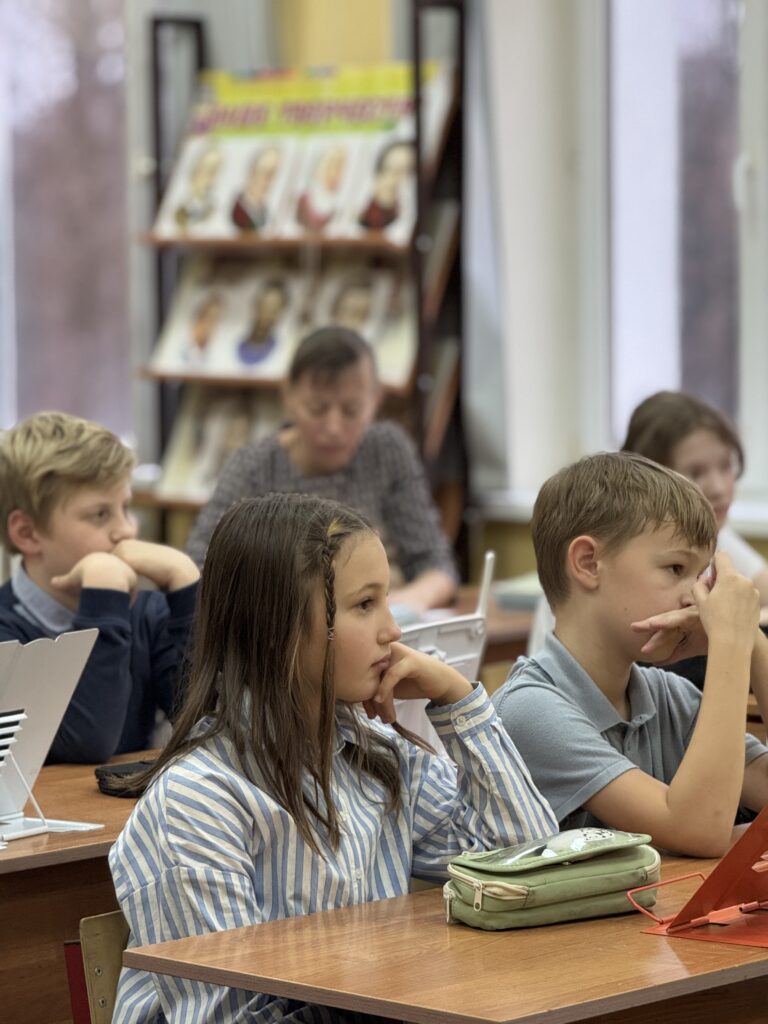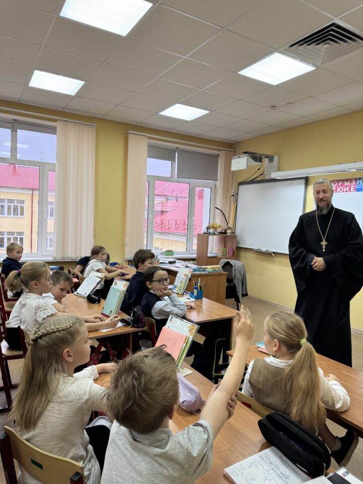 В этот же день о. Андрей провел уроки в четвертых классах по предмету «Основы православной культуры» в форме беседы, в рамках проекта задай вопрос священнику. В преддверии праздника Казанской Божией Матери и Дня народного единства говорили о героях России от святых Александра Невского, Дмитрия Донского и прп. Сергия Радонежского до Виктора Талалихина и Александра Монетова.