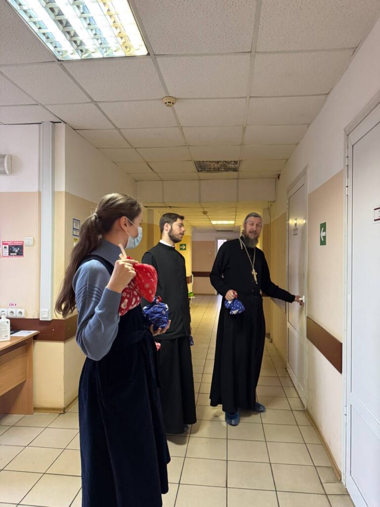 19 декабря, в день памяти святителя Николая Чудотворца, настоятель Знаменского храма в Дубровицах протоиерей Андрей Грицышин, волонтеры социальной службы и молодежь Знаменского храма посетили Подольскую областную клиническую больницу и поздравили с днем памяти свт. Николая, наступающими праздниками Новолетия и Рождества Христова медицинский персонал и раненых воинов, проходящих лечение.