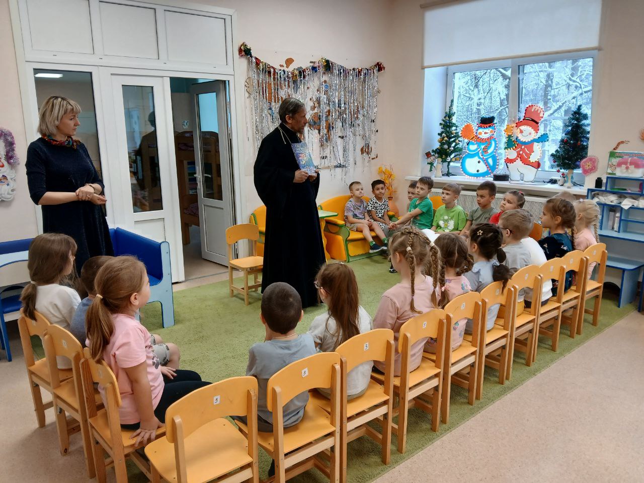 26 декабря в рамках просветительского  проекта «Добрый сад», по приглашению заместителя директора Панкичевой Елены Владимировны настоятель храма Воскресения Словущего д. Сертякино протоиерей Борис Трещанский посетил  дошкольное отделение МБОУ «Лицей Климовска».
