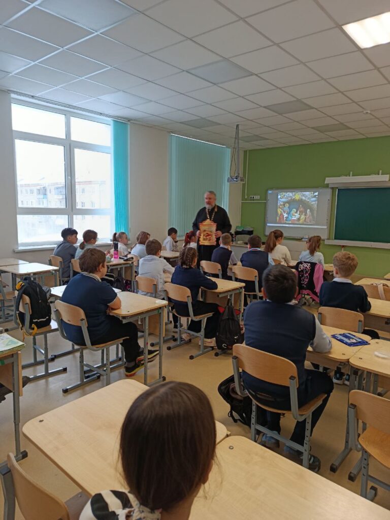 22 января настоятель Благовещенского храма деревни Матвеевское иерей Андрей Саломасов посетил МОУ «Бородино». Священник провел уроки для учащихся четвертых классов в рамках образовательной программы ОРКСЭ. Тема уроков включала два ключевых православных праздника — Рождество Христово и Крещение Господне.